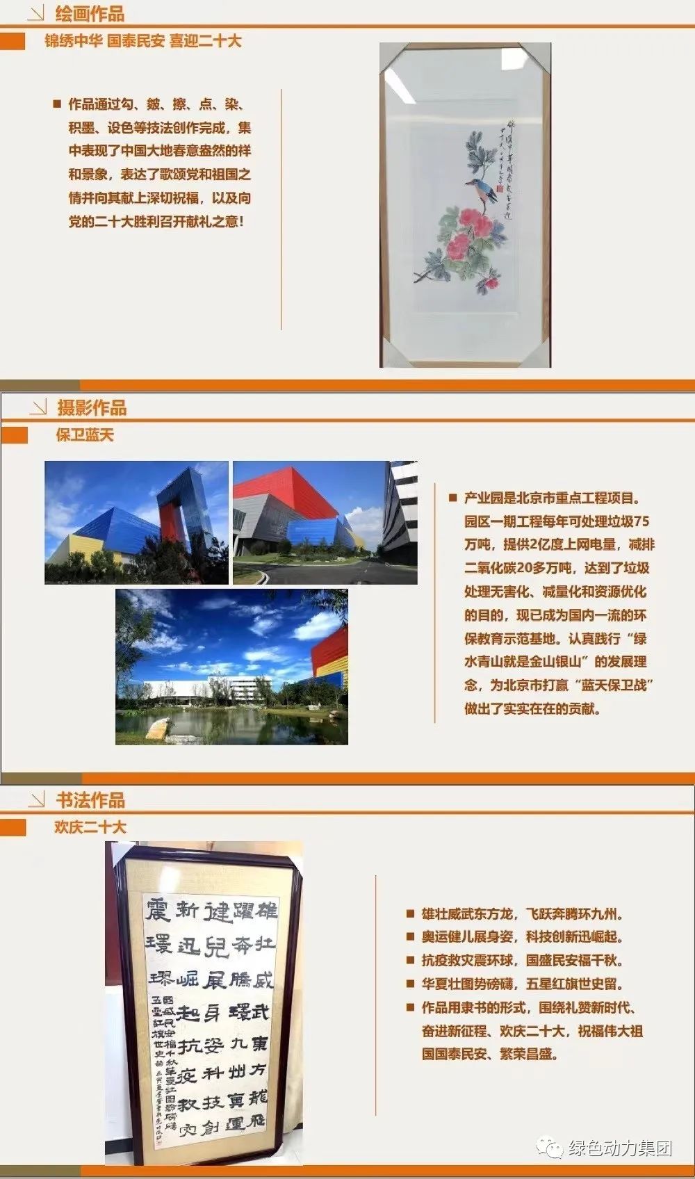 8月29日,国资公司工会在北京隆福大厦发布评选结果并举行了颁奖仪式。绿色动力集团通州公司职工宋旭光绘画作品《国泰民安 喜迎二十大》荣获二等奖,集团公司副总经理郝敬立摄影作品《保卫蓝天》荣获三等奖,惠州公司职工李梦书法作品《欢庆二十大》荣获三等奖。